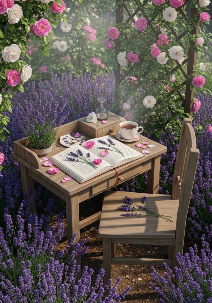 Include a small shelf for field guides, colored pencils, and pressed flower supplies near your journal station. Surround the area with strongly scented plants like lavender, herbs, and roses to inspire all senses. This is one of those deeply personal garden ideas that makes your rustic garden not just beautiful to look at, but meaningful to experience.
