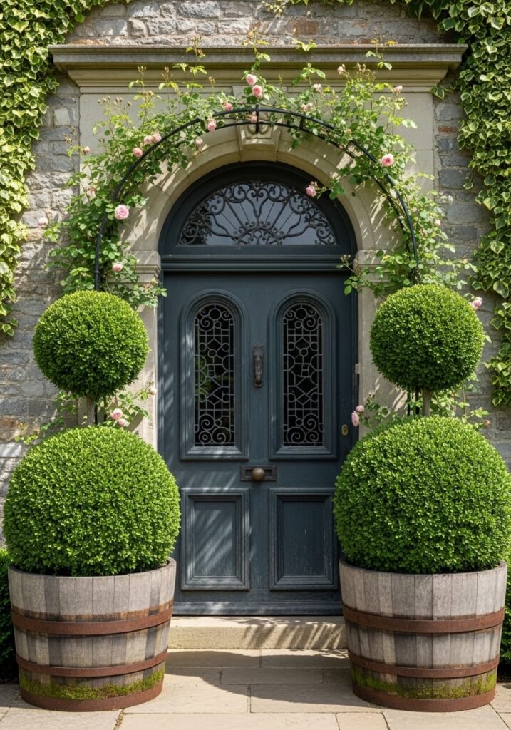 Plant boxwood or other evergreen topiaries in rustic containers like wooden barrels, galvanized pails, or aged urns. The contrast between formal, sculpted greenery and rough, weathered containers creates sophisticated rustic garden decor. Place topiaries symmetrically flanking doorways or paths for a structured, elegant welcome.