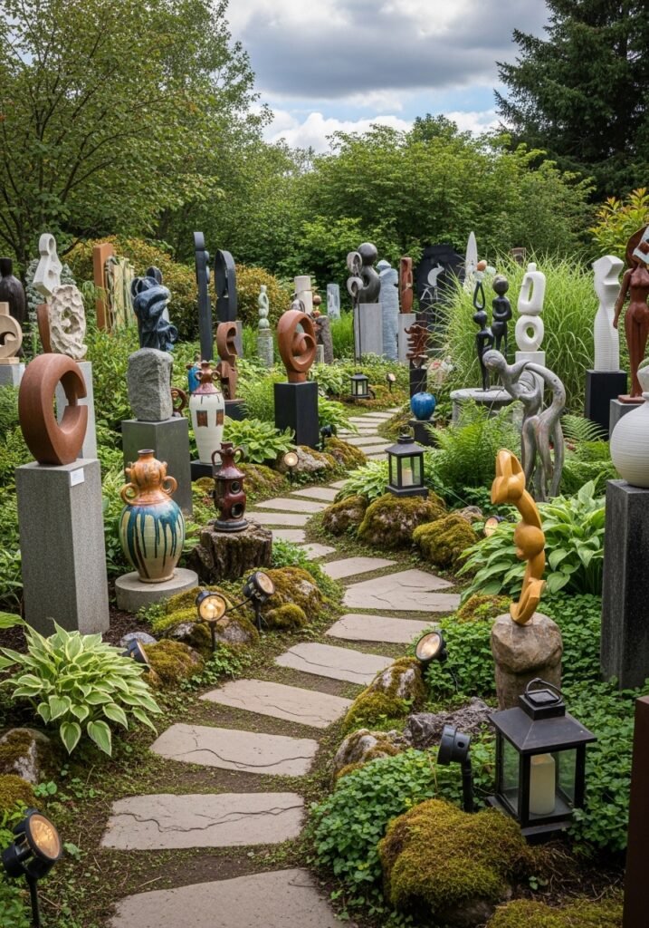 Display weather-resistant artwork, metal sculptures, or ceramic pieces throughout your garden to create an outdoor art gallery experience. Position each piece as a discovery point along garden paths so visitors encounter art around every corner. This curated approach to garden decor elevates your outdoor space to gallery-level sophistication.