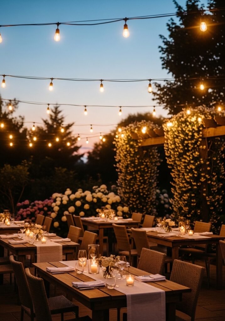 Crisscross string lights overhead across your patio, pergola, or between trees for year-round magical evening ambiance. Choose warm-white Edison bulbs on dark wire for the most authentic rustic garden atmosphere. The soft, golden glow transforms any outdoor space into an enchanting nighttime wonderland.