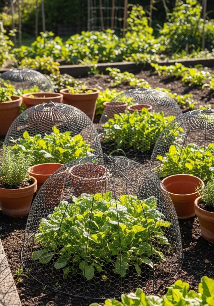 Bend chicken wire into dome-shaped garden cloches to protect young plants while adding vintage rustic garden decor charm. These wire domes look beautiful in vegetable beds and cottage gardens, creating a greenhouse-like structure with old-fashioned appeal. They allow sunlight and rain to reach plants while deterring birds and small animals.