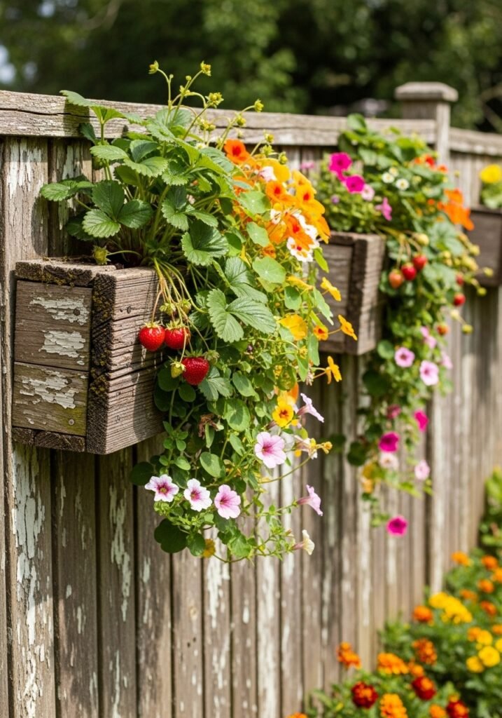 Add built-in planter boxes along the top or sides of your rustic garden fence to create a vertical garden that maximizes growing space. Construct them from matching reclaimed wood so they blend seamlessly with the fence structure. Fill with trailing flowers, strawberries, or cascading herbs for a productive living fence.