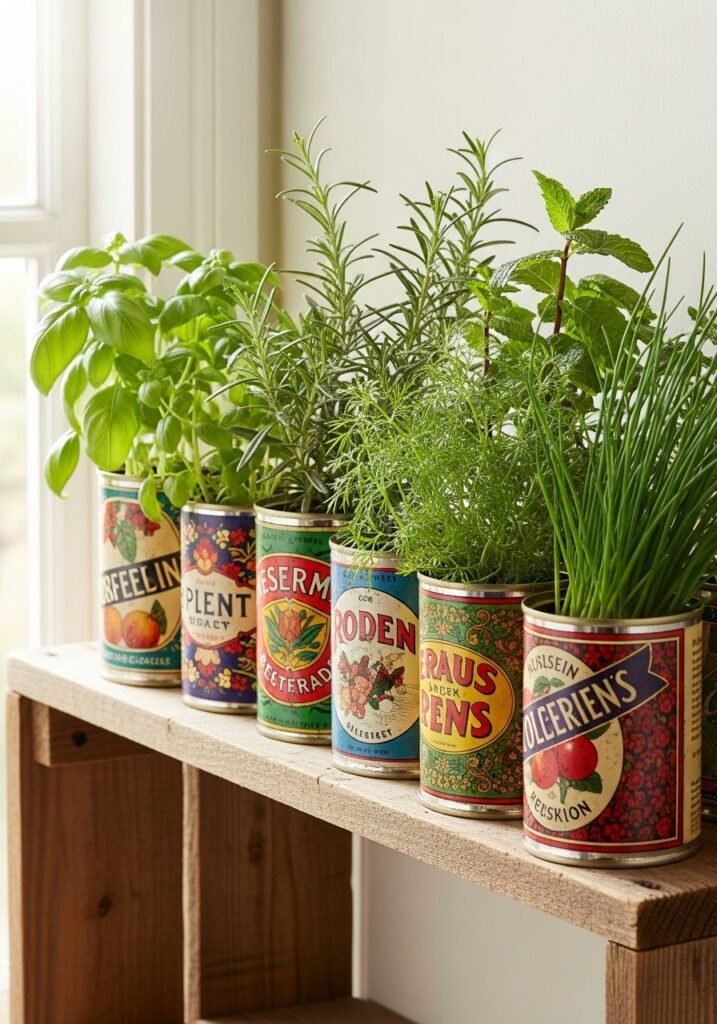 Collect decorative vintage tin cans—coffee, tea, olive oil—and repurpose them as charming herb planters for windowsills, shelves, and tables. The colorful vintage labels and aged metal patina add instant rustic garden decor character. Group them together for a curated, collected look that feels both nostalgic and functional.