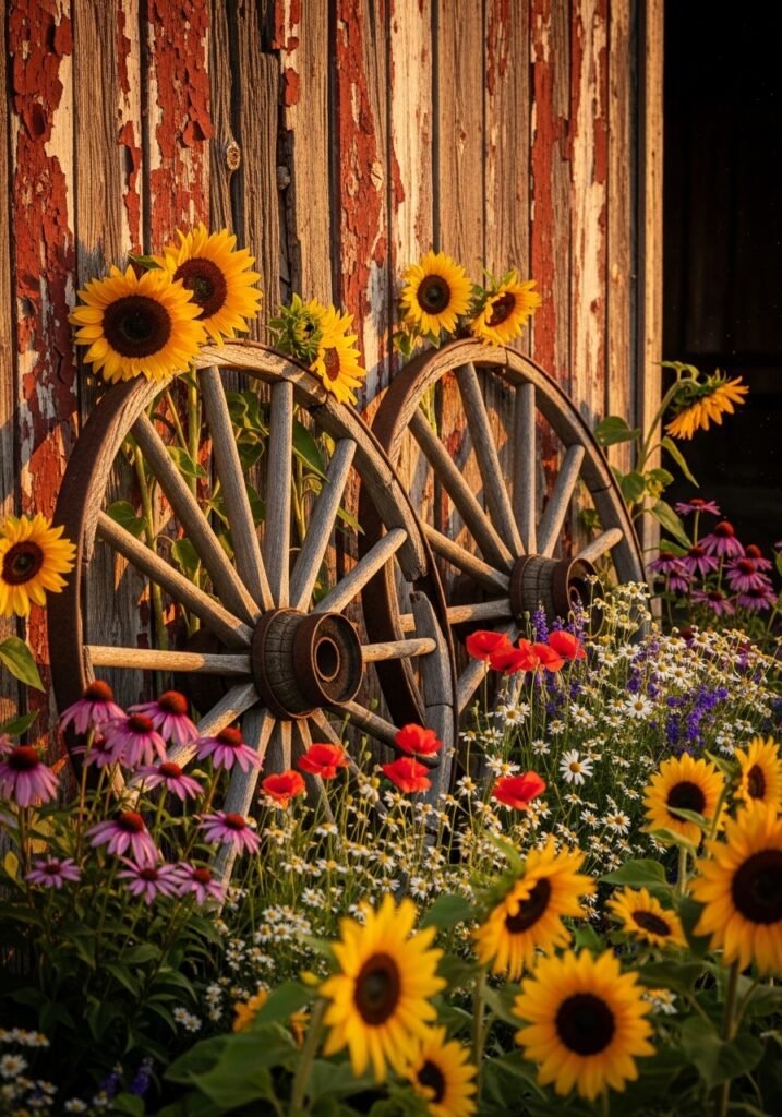 Old wagon wheels propped against fences or trees create instant western-rustic charm. These iconic pieces of rustic garden decor bring a sense of history and nostalgia to any outdoor space. Lean them against a barn wall or incorporate them into garden bed borders for dramatic visual impact.
