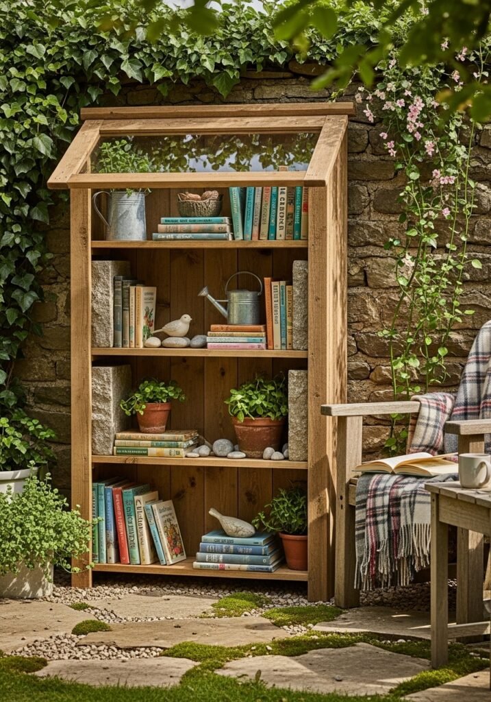 Cover it with a small roof or position it under an overhang to protect contents from rain and excessive sun exposure. This literary garden decoration idea creates a cultured, relaxed atmosphere perfect for reading afternoons in the garden. It’s one of those unexpected garden ideas that makes your rustic gardens feel like a true extension of your home.