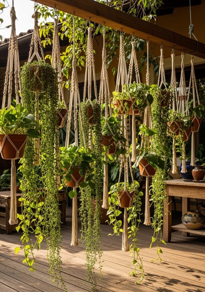 Create a living curtain by hanging multiple plants from a horizontal beam, rod, or branch at varying heights. Use macramé hangers, rope, or chain for an eclectic, bohemian-rustic look. This living screen of trailing pothos, string of pearls, or ferns provides privacy while adding lush garden decor beauty.