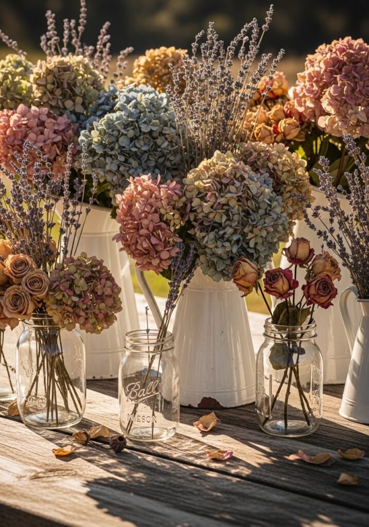 Create stunning dried flower arrangements from your own garden harvest—hydrangeas, lavender, statice, and roses air-dry beautifully. Display them in vintage pitchers, mason jars, or galvanized buckets throughout your outdoor spaces. These everlasting arrangements provide year-round rustic garden decor without any watering or maintenance required.