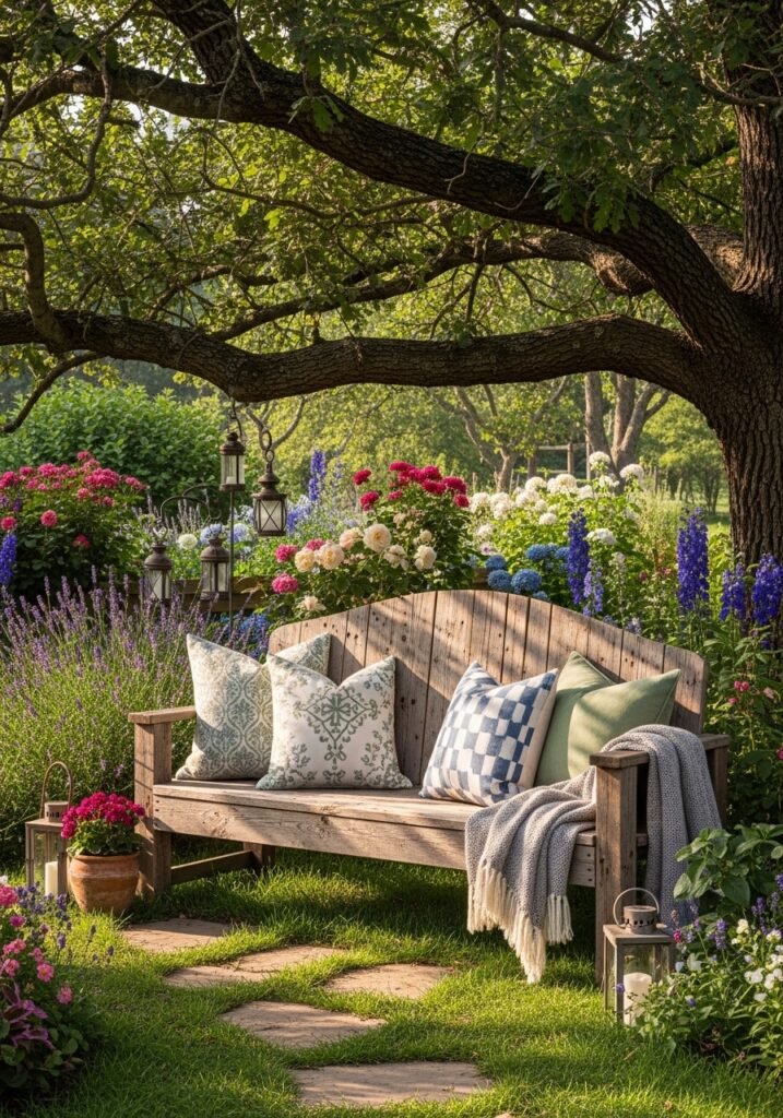 Add a cozy throw blanket and outdoor pillows for a space that invites you to sit and stay awhile. This garden inspiration piece encourages you to actually enjoy your outdoor space daily. Among all garden decor projects, a reclaimed wood bench is the one investment that combines beauty, comfort, and rustic charm perfectly.