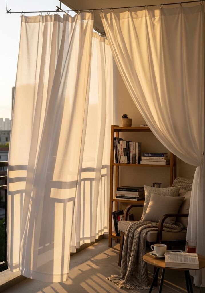 Adding outdoor curtains is one of the most elegant small patio ideas on a budget for creating privacy and ambiance. Hang inexpensive drop cloth curtains, shower curtains, or sheer fabric panels from a simple tension rod, wire cable, or PVC pipe frame. They instantly create a cozy, enclosed feeling that makes your patio feel like an outdoor room.