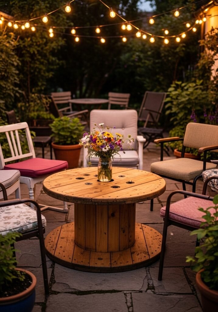A wooden cable spool makes a fantastic rustic coffee table and is among the most charming small patio ideas on a budget. These large spools are often discarded by electrical companies and can be obtained for free. Simply sand, stain, or paint the spool and place it in the center of your seating arrangement.
