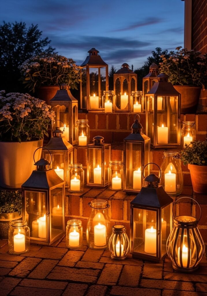 Gathering lanterns from the dollar store creates a romantic ambiance as part of your small patio ideas on a budget. Arrange various sizes of glass or metal lanterns on tables, steps, and along pathways. Fill them with LED candles, fairy lights, or real votives for a warm, flickering glow that enchants every evening.