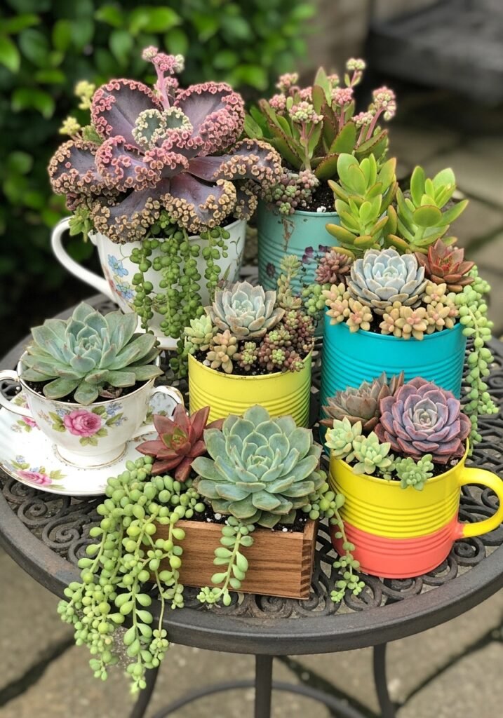 A succulent garden display is a low-maintenance yet gorgeous addition to any small patio ideas on a budget project. Succulents are inexpensive, drought-tolerant, and come in stunning varieties of colors, shapes, and textures. Plant them in repurposed containers like teacups, tin cans, wooden boxes, or broken pots for a whimsical arrangement.