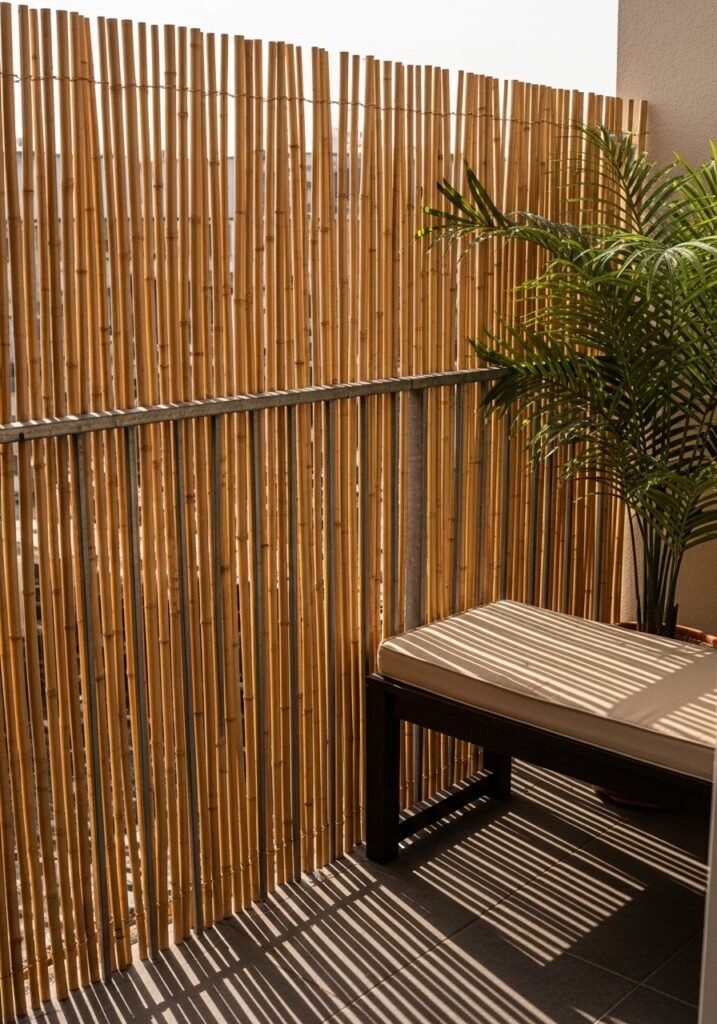 Installing a bamboo privacy screen is an affordable and natural-looking option among small patio ideas on a budget. Bamboo roll fencing is inexpensive and can be attached to existing fences, railings, or freestanding frames using zip ties or wire. It instantly creates a tropical, spa-like atmosphere while blocking unwanted views from neighbors.