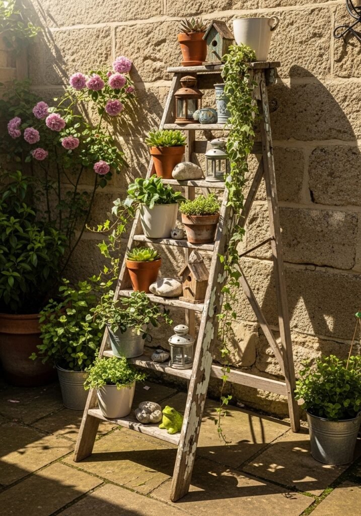 Repurposing an old wooden ladder into a tiered plant stand is a Pinterest-favorite among small patio ideas on a budget. Lean the ladder against a wall and place potted plants, herbs, and flowers on each rung. This vertical display maximizes your growing space while adding architectural interest and charming cottage-garden character.