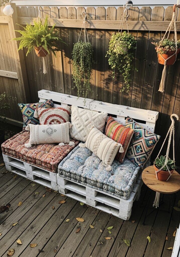 This approach lets you customize the size to fit your small patio perfectly. You can paint the pallets in white, teal, or natural wood tones depending on your aesthetic. Add a few throw pillows in bohemian patterns, and you’ve created an Instagram-worthy outdoor lounge without spending more than a few dollars.