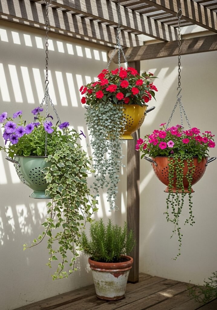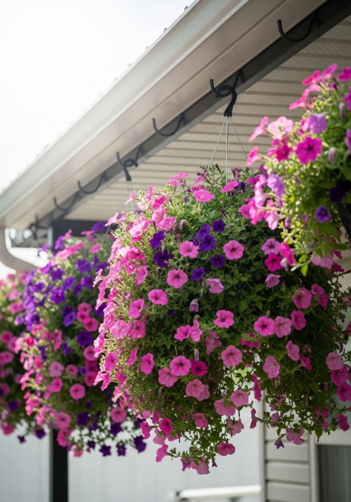 Multiple hanging baskets at varying heights create a lush, garden-center feel on even the smallest patio. They draw attention upward, making the space feel larger and more dynamic. Watering regularly keeps them blooming all season, providing continuous color and beauty for just a few dollars per basket.