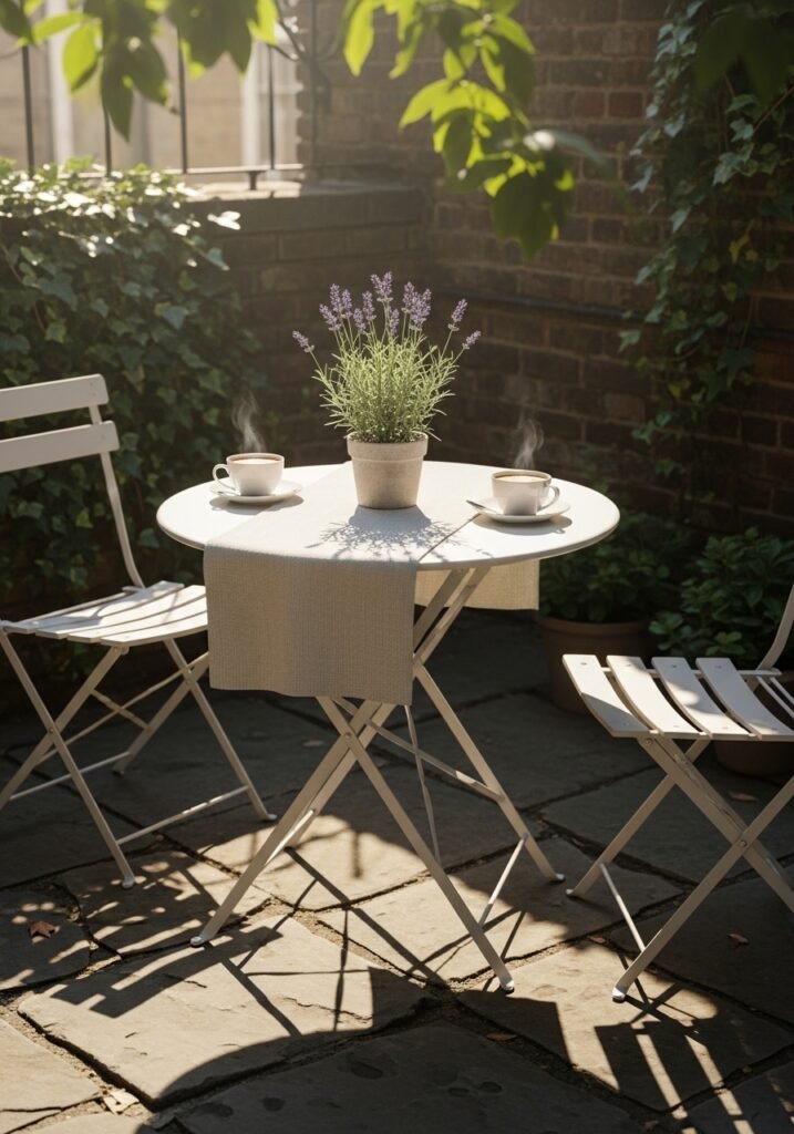Creating a small bistro dining corner is among the most functional small patio ideas on a budget. A simple folding table and two chairs provide a charming spot for morning coffee, intimate dinners, or casual meals outdoors. Shop for affordable bistro sets at discount retailers, or repurpose chairs you already own with matching paint.