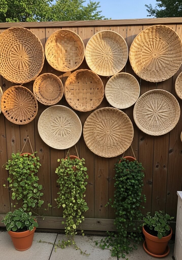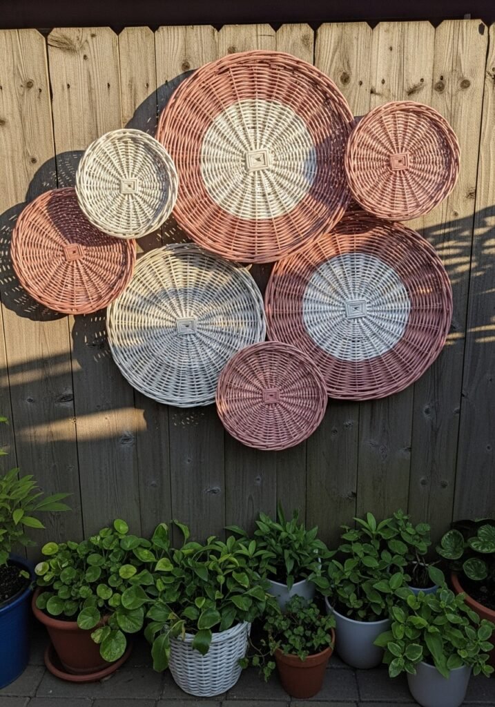 Repurposing wicker paper plate holders as wall décor is a crafty hack within small patio ideas on a budget. These inexpensive holders, available at dollar stores in packs, create a textured gallery wall when grouped together. Paint them in ombré colors, metallic finishes, or leave them natural for instant boho wall art.
