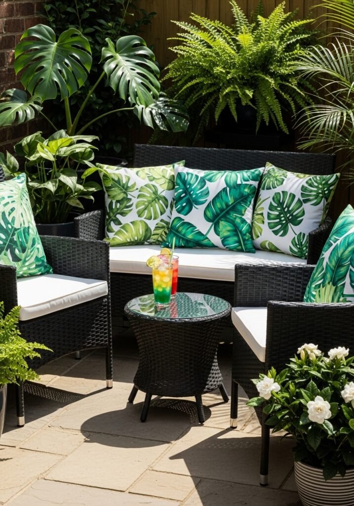 Refreshing your outdoor cushions is one of the easiest small patio ideas on a budget for an instant makeover. Rather than buying new cushions, purchase affordable outdoor fabric or weather-resistant covers and re-cover your existing ones. You can sew simple envelope-style covers or use fabric glue for a no-sew solution.