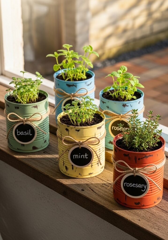 Line the cans along a windowsill, mount them on a board, or cluster them on a table for a charming kitchen-garden display. This project costs virtually nothing and provides fresh cooking herbs throughout the growing season. The rustic, cottage-garden aesthetic is endlessly popular on Pinterest and adds genuine charm to any small patio.