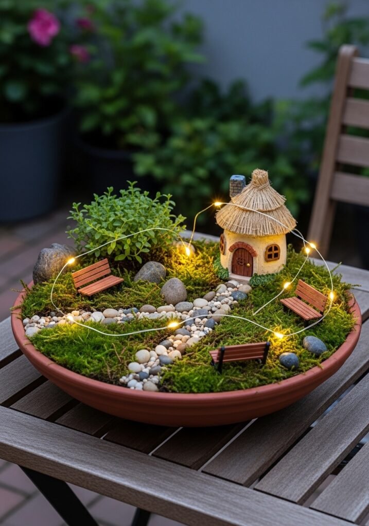 Creating a miniature fairy garden is one of the most whimsical small patio ideas on a budget. Use a large shallow container, broken pot, or designated ground area to build a tiny landscape with miniature plants, pebble pathways, tiny figurines, and small decorative houses. Dollar store accessories keep this enchanting project affordable.