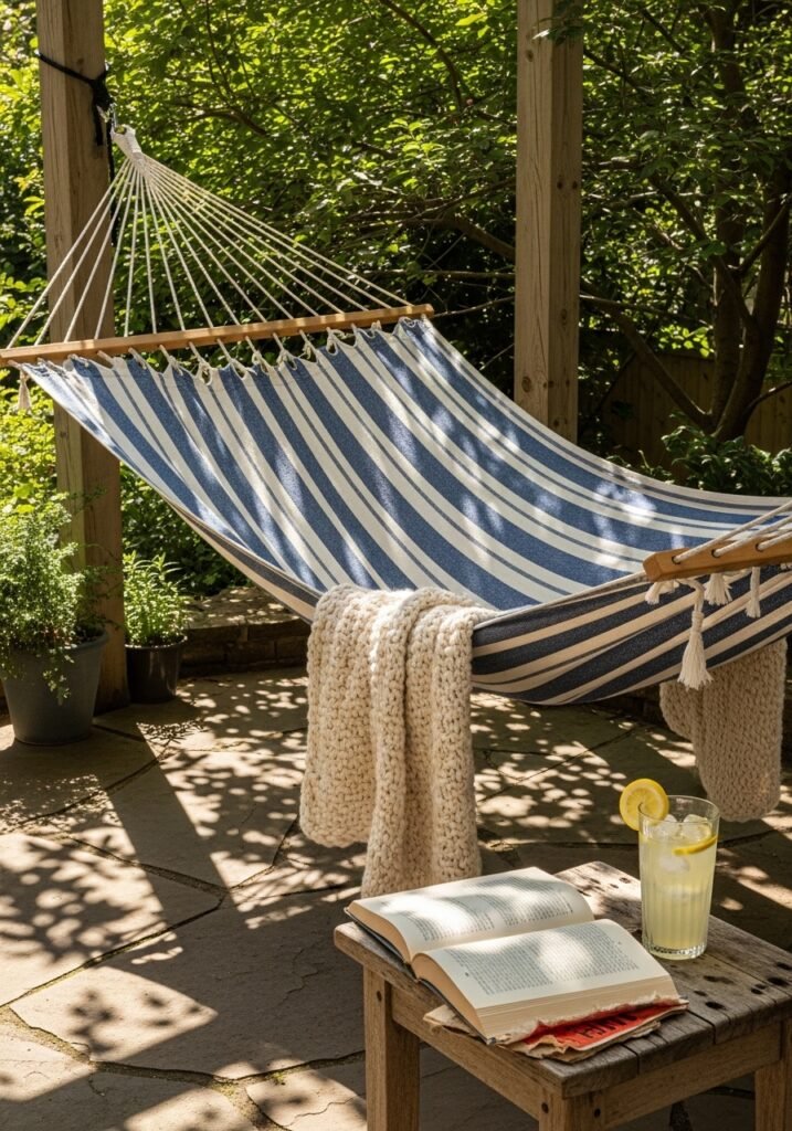 Adding a hammock to your patio is a dreamy and affordable option among small patio ideas on a budget. Compact hammocks with stands are available at very reasonable prices, or you can hang a fabric hammock between two sturdy posts, trees, or wall-mounted hooks. It instantly creates the ultimate relaxation station.