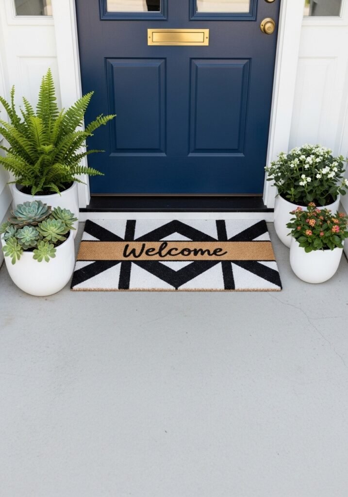 A custom stenciled welcome mat adds personality and charm as part of your small patio ideas on a budget. Purchase a plain coir doormat and use stencils and outdoor paint to create custom designs, monograms, or witty sayings. Popular Pinterest designs include botanical prints, geometric patterns, and funny welcome messages.