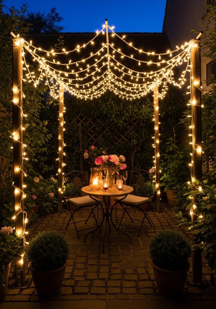 Creating a magical string light canopy overhead is one of the easiest small patio ideas on a budget that delivers maximum visual impact. Purchase affordable LED string lights from any dollar store or online retailer, then drape them across your patio in a zigzag or parallel pattern using hooks or tension wire. The warm glow instantly transforms even the tiniest space into a romantic evening retreat.