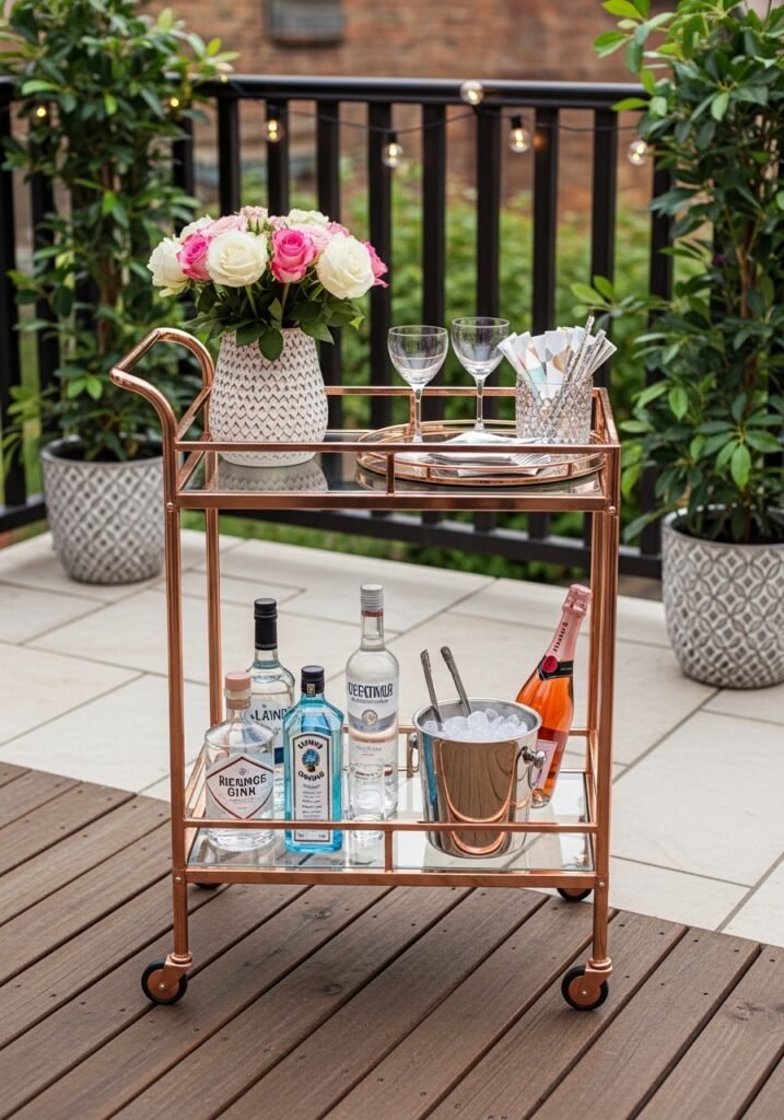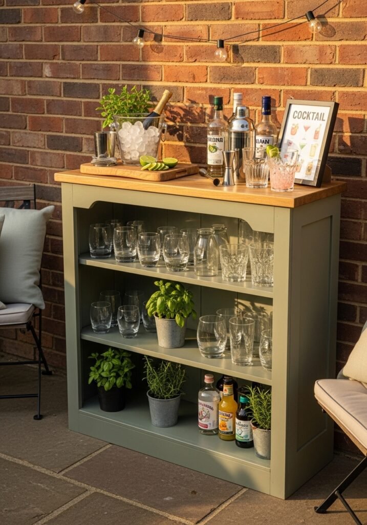 Repurposing an old bookshelf as an outdoor bar or serving station is a clever twist on small patio ideas on a budget. Weatherproof a thrifted bookshelf with exterior paint or sealant, then stock the shelves with glassware, bottles, and bar accessories. The top surface serves as your prep and serving area.