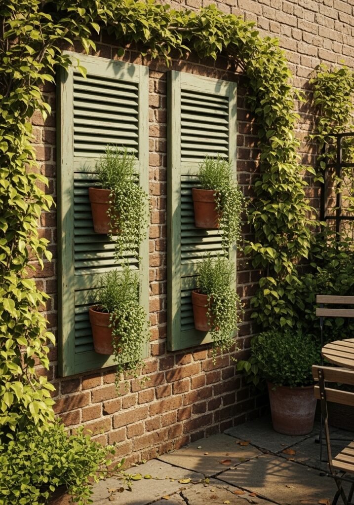 Old window shutters make charming wall décor in the category of small patio ideas on a budget. Mount salvaged shutters on your patio wall and use them to hang small plants, photos, or decorative items. Their slatted design adds architectural interest and vintage character to any outdoor space.