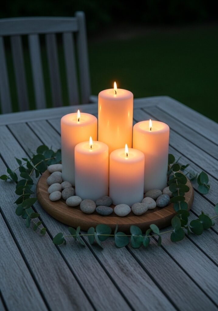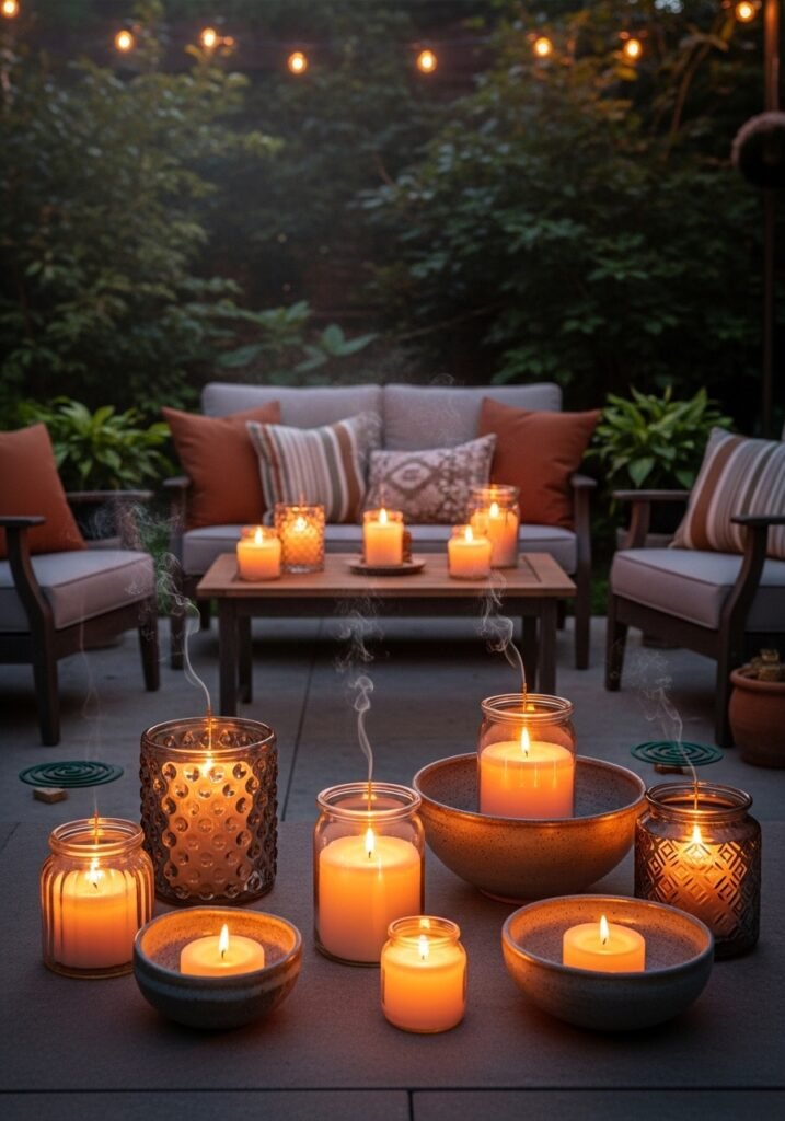 A curated collection of citronella candles serves double duty in small patio ideas on a budget. They repel mosquitoes naturally while providing beautiful candlelight ambiance. Make your own by pouring melted soy wax mixed with citronella essential oil into decorative containers like mason jars, teacups, or ceramic bowls.