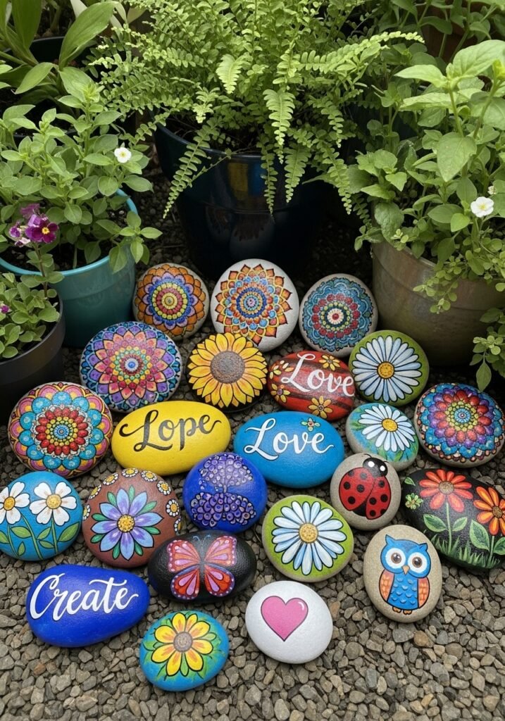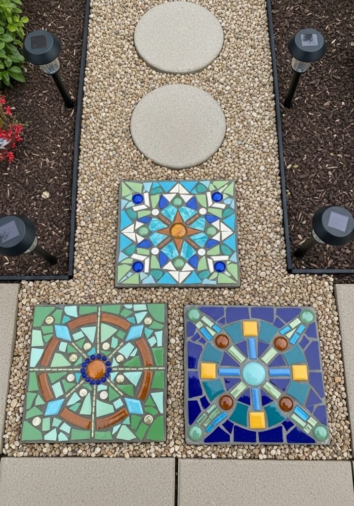 DIY mosaic stepping stones add artistic pathways to small patio ideas on a budget. Pour concrete into round molds (even old cake pans work) and press colorful pieces of broken tiles, plates, glass beads, or marbles into the surface before it dries. Each stone becomes a unique piece of garden art.