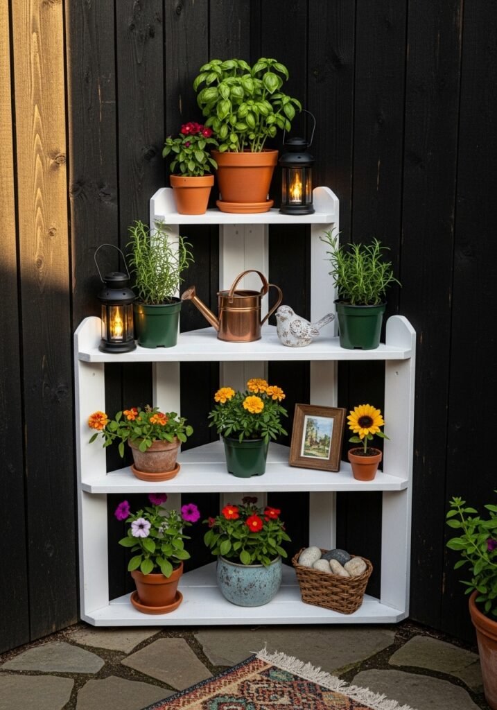 You can find old ladders at garage sales, thrift stores, or even use a new wooden ladder painted in your preferred color. The staggered heights create a beautiful cascading effect with your plants. Add small lanterns, picture frames, or decorative items between the pots for a styled, curated look that appears effortlessly beautiful.