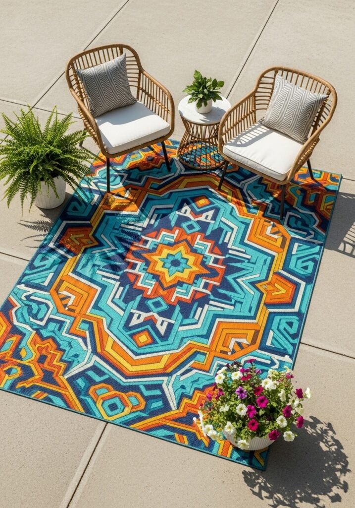 An outdoor rug is a game-changing addition when exploring small patio ideas on a budget. A colorful, weather-resistant rug defines your seating area, adds warmth underfoot, and makes the entire patio feel like an extension of your indoor living room. You can find affordable outdoor rugs at discount stores, thrift shops, or even paint your own using a plain drop cloth and stencils.