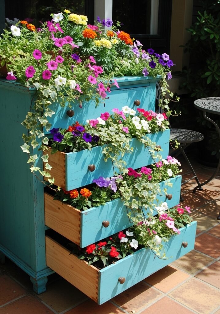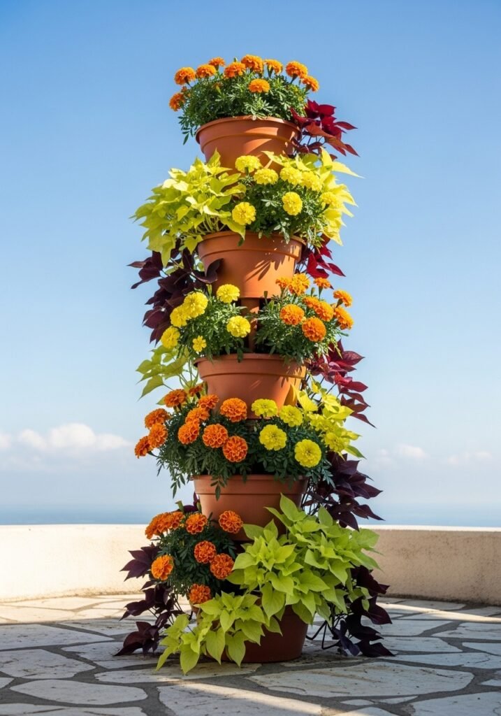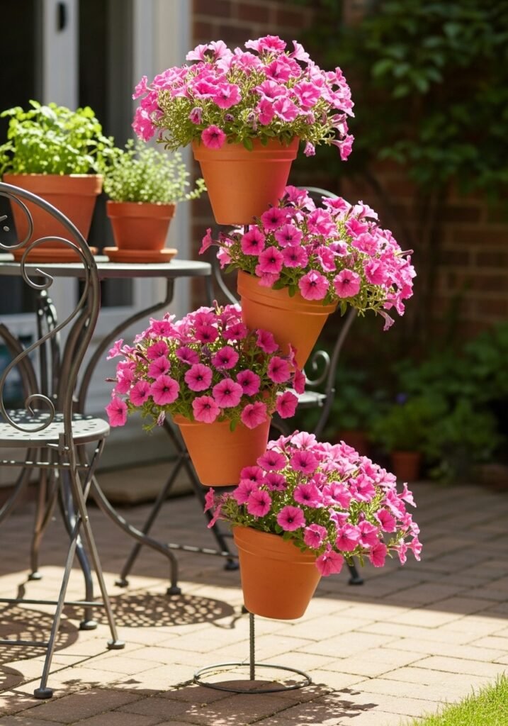 Plant colorful cascading flowers like petunias, calibrachoa, or verbena in each pot for a overflowing waterfall of blossoms. The tower occupies just a single pot’s worth of floor space while providing the visual impact of a large flower bed. This project costs under twenty dollars and creates an absolutely show-stopping garden feature for your small patio.