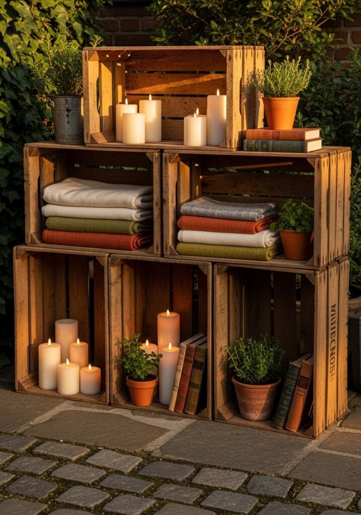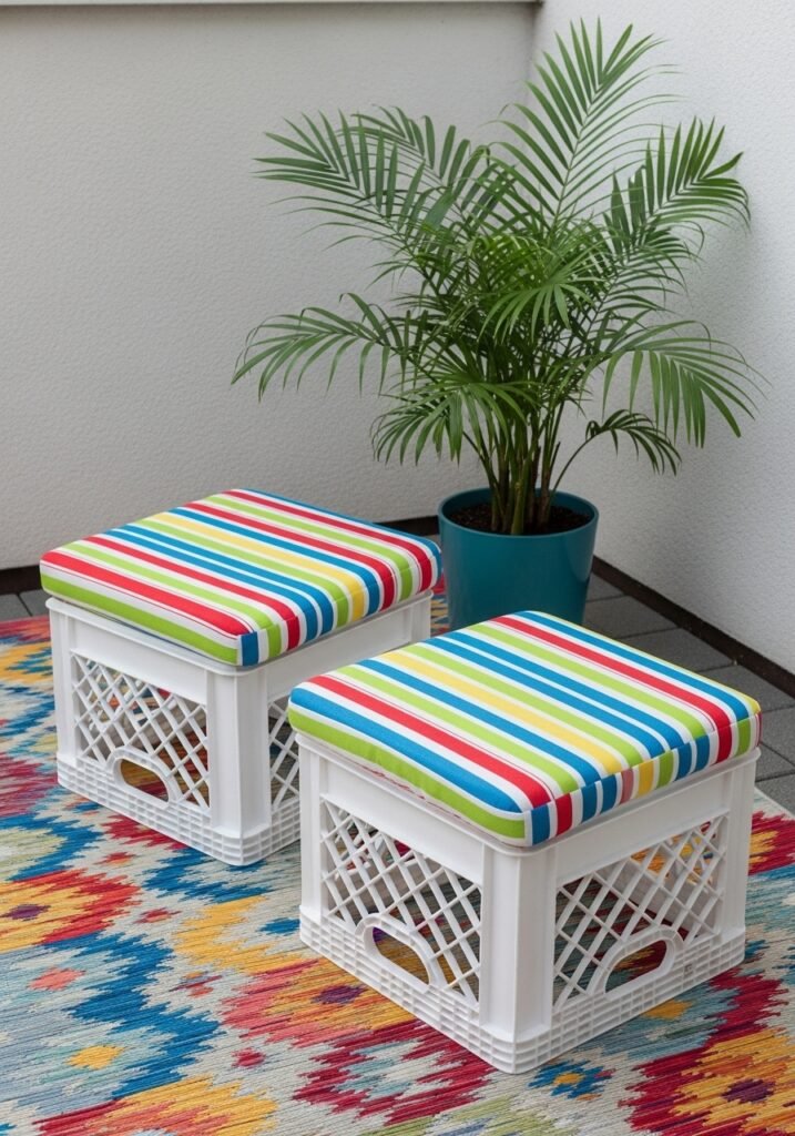 Stack two crates together for comfortable seating height, then zip-tie them for stability. Spray paint the visible portions in your preferred color scheme. These lightweight, stackable seats cost next to nothing and provide flexible seating that stores compactly when not needed. They’re perfect for casual outdoor gatherings on your small patio.