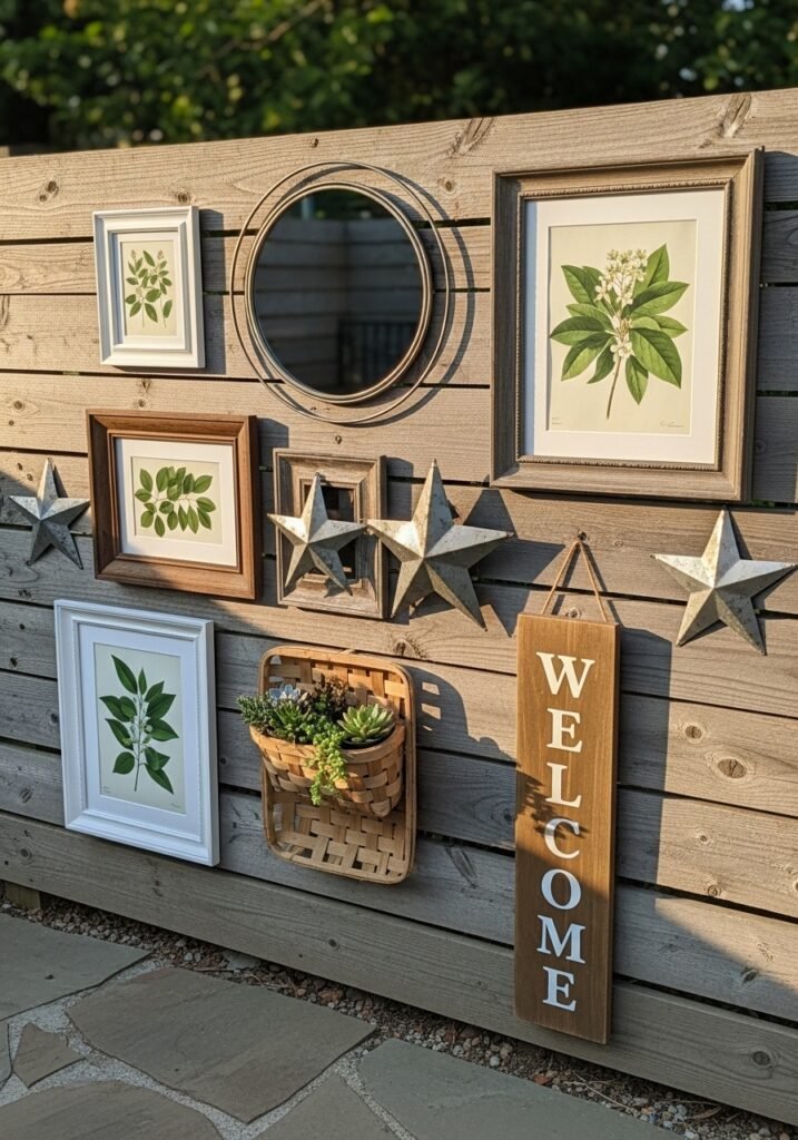 This outdoor wall art is surprisingly weather-resistant and incredibly affordable. Mix round and oval shapes in natural tones, or spray paint some baskets in coordinating colors for a more curated look. The entire display can cost under fifteen dollars and creates a stunning focal point that receives endless compliments from guests.