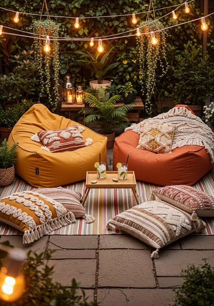 Bean bags are lightweight, easy to move, and can be stored when not in use, making them perfect for small spaces. Pair them with a low table, outdoor rug, and string lights for a laid-back bohemian lounge vibe. This relaxed seating option costs less than traditional outdoor furniture and creates an inviting atmosphere that encourages lingering and conversation.