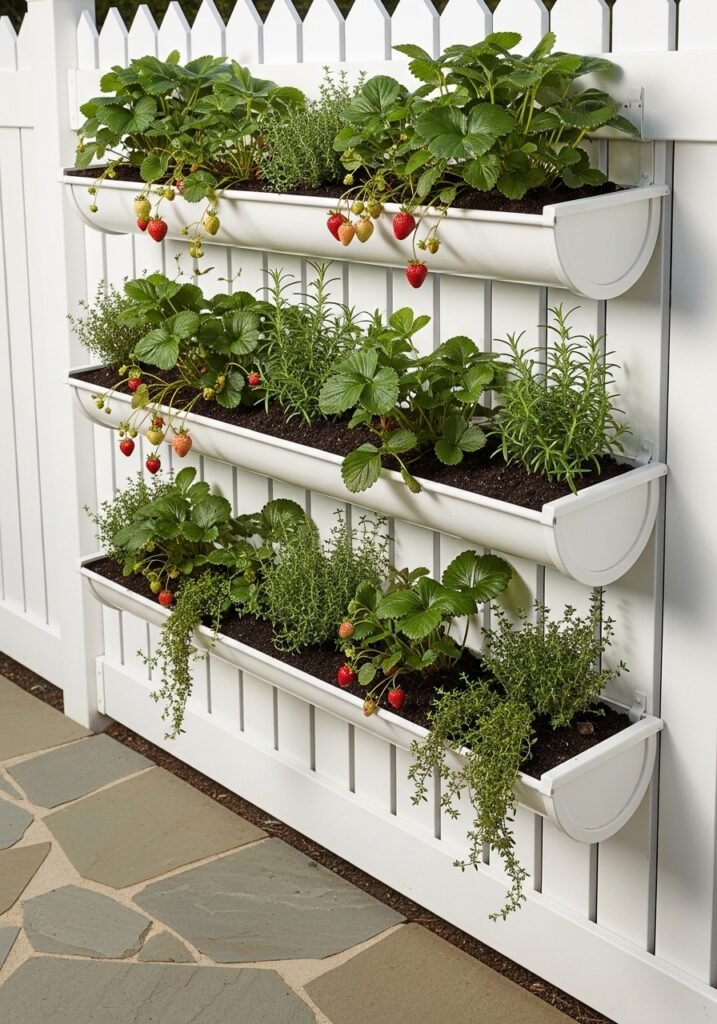 Mounting rain gutters as wall planters is an ingenious space-saver among small patio ideas on a budget. Attach lengths of vinyl or metal guttering horizontally to your fence or wall at staggered heights. Fill with soil and plant shallow-rooted flowers, herbs, lettuce, or strawberries for a modern, linear growing system.
