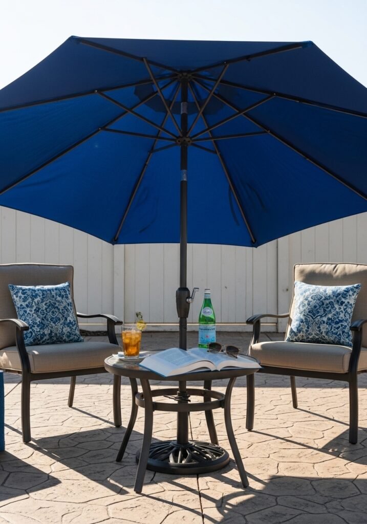 A freestanding patio umbrella provides instant shade as a practical part of small patio ideas on a budget. Affordable umbrellas with weighted bases require no permanent installation and can be repositioned throughout the day to follow the shade. Choose bold colors or classic neutrals to complement your existing décor scheme.