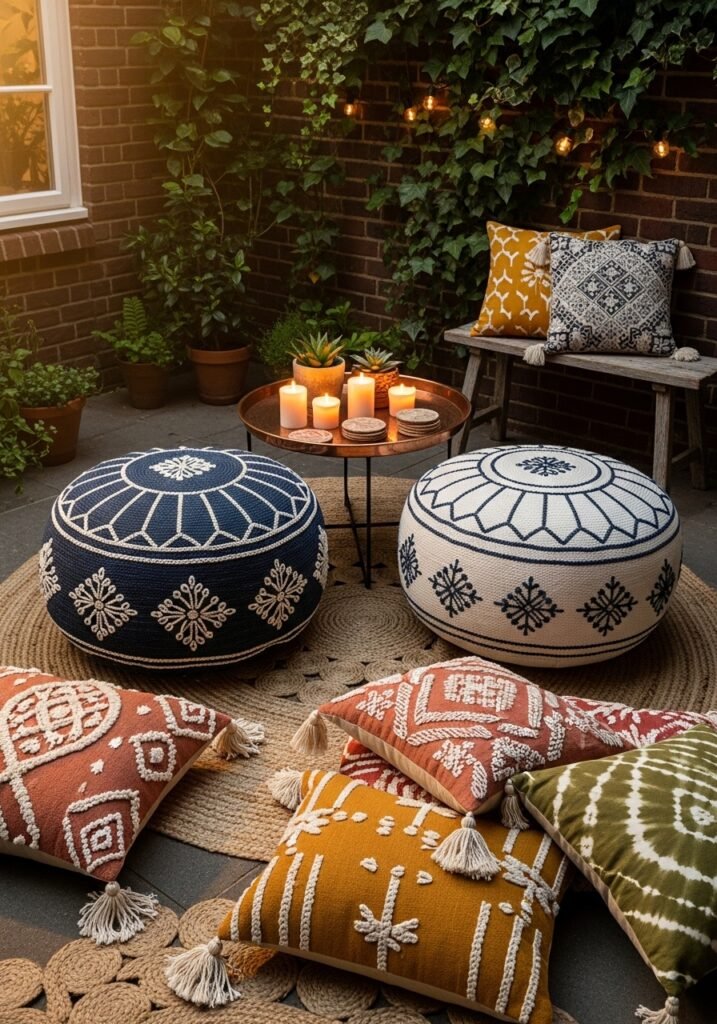 Oversized floor pillows create relaxed, bohemian seating in small patio ideas on a budget. Sew simple square covers from outdoor fabric or canvas drop cloths and stuff with affordable polyester filling or old pillows. Scatter them on your patio rug for ground-level lounging that feels exotic and inviting.