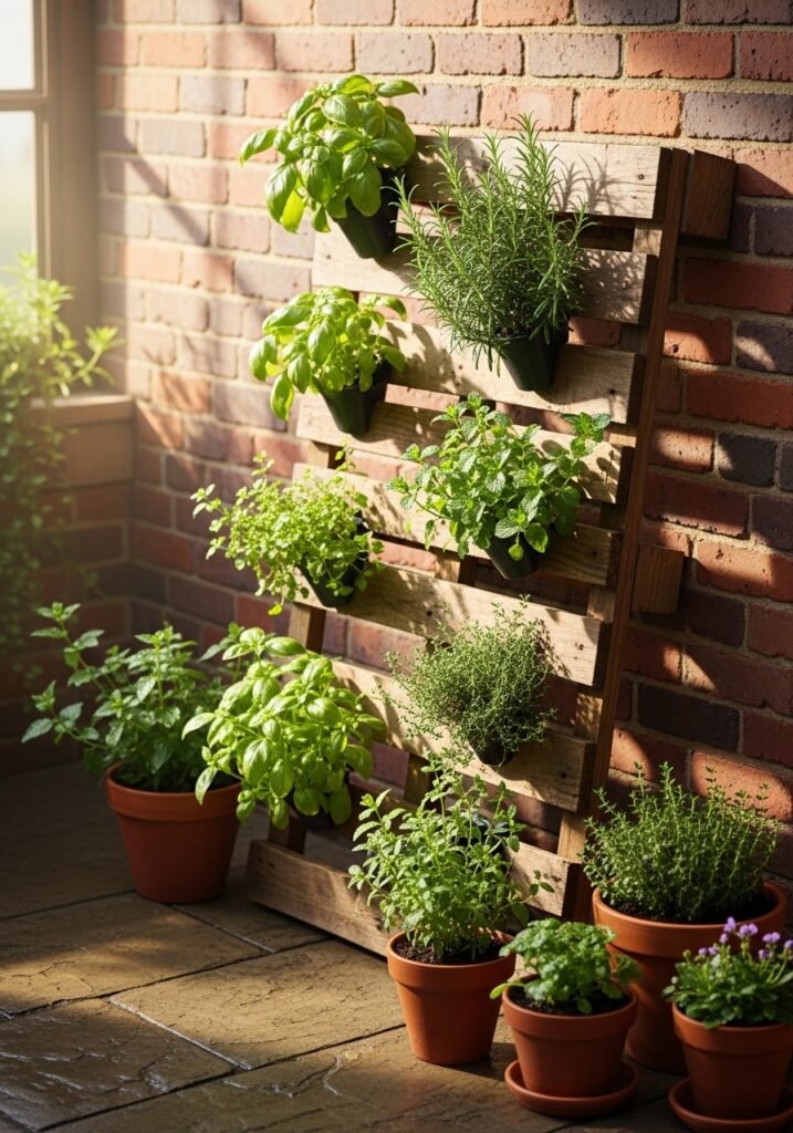 A vertical herb garden is a brilliant way to combine functionality with beauty among small patio ideas on a budget. Use a wooden pallet, hanging shoe organizer, or stacked tin cans mounted on a board to grow herbs like basil, mint, rosemary, and thyme. This saves precious floor space while adding gorgeous greenery to your vertical surfaces.
