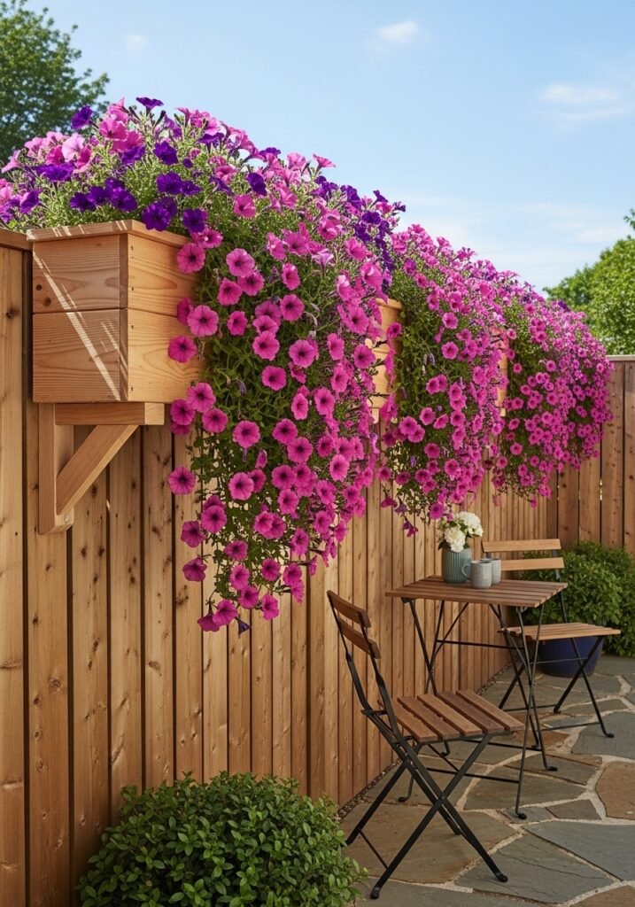 Fence planters transform a plain boundary into a living garden wall without sacrificing any floor space. Paint the boxes to match or contrast with your fence color for a designed, intentional look. Plant trailing varieties like wave petunias for cascading color that softens hard fence lines. This project adds enormous garden beauty for minimal cost on your small patio.