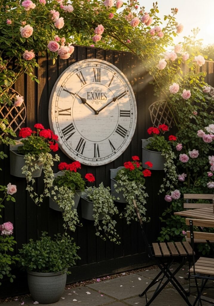 Hanging a large outdoor clock creates a decorative focal point in small patio ideas on a budget. Oversized wall clocks add a European garden feel and serve a practical purpose. Find affordable options at discount home stores, thrift shops, or create your own from a wooden circle, clock mechanism kit, and paint.