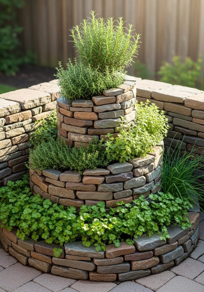 Mediterranean herbs like rosemary and thyme thrive at the drier, sunnier top, while moisture-loving herbs like parsley and cilantro grow at the base. This functional garden sculpture costs very little using found stones and provides fresh herbs for cooking all season. The spiral shape adds artistic interest and conversation value to your small patio.