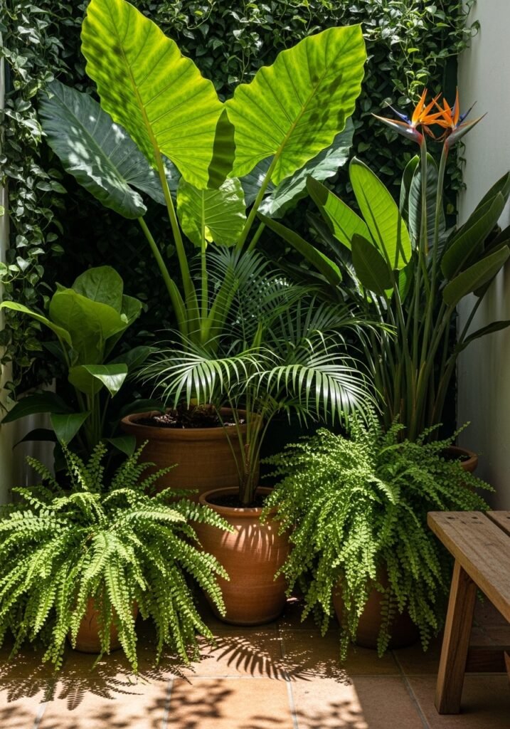 Creating a tropical plant arrangement brings vacation vibes to small patio ideas on a budget. Group affordable tropical-looking plants like cannas, elephant ears, bird of paradise, and large ferns in a corner of your patio. Even hardy plants that merely look tropical can create a lush, exotic atmosphere.