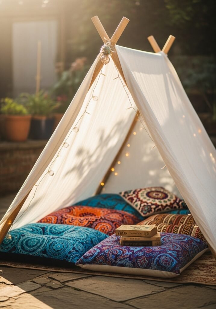 A small fabric tent or teepee creates a cozy retreat within small patio ideas on a budget. Build a simple A-frame structure from wooden poles or bamboo stakes, then drape fabric, bedsheets, or outdoor curtain panels over the frame. This creates a shaded, intimate space perfect for reading, napping, or children’s play.