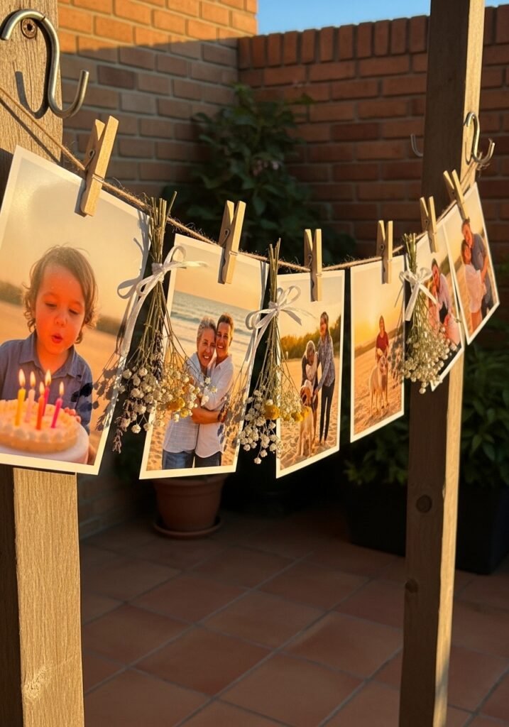 Stringing a clothespin photo display across your patio is a sentimental touch within small patio ideas on a budget. Stretch twine, wire, or string between two points and use wooden clothespins to hang printed photos, postcards, or small artworks. This creates a personalized, ever-changing gallery that tells your family’s story outdoors.
