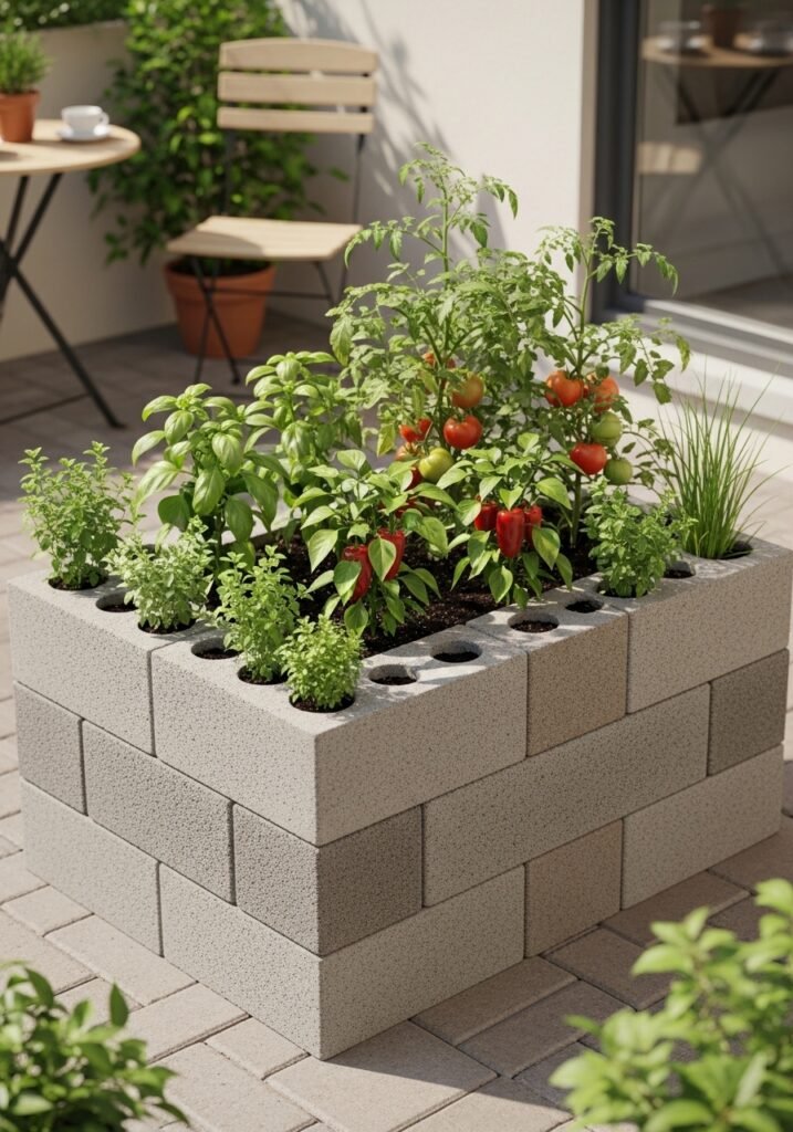 Building a small raised garden bed from concrete blocks is a productive approach to small patio ideas on a budget. Stack blocks in a rectangle or square shape to create a contained growing area for vegetables, flowers, or herbs. The holes in the blocks provide extra planting pockets for small plants or herbs.