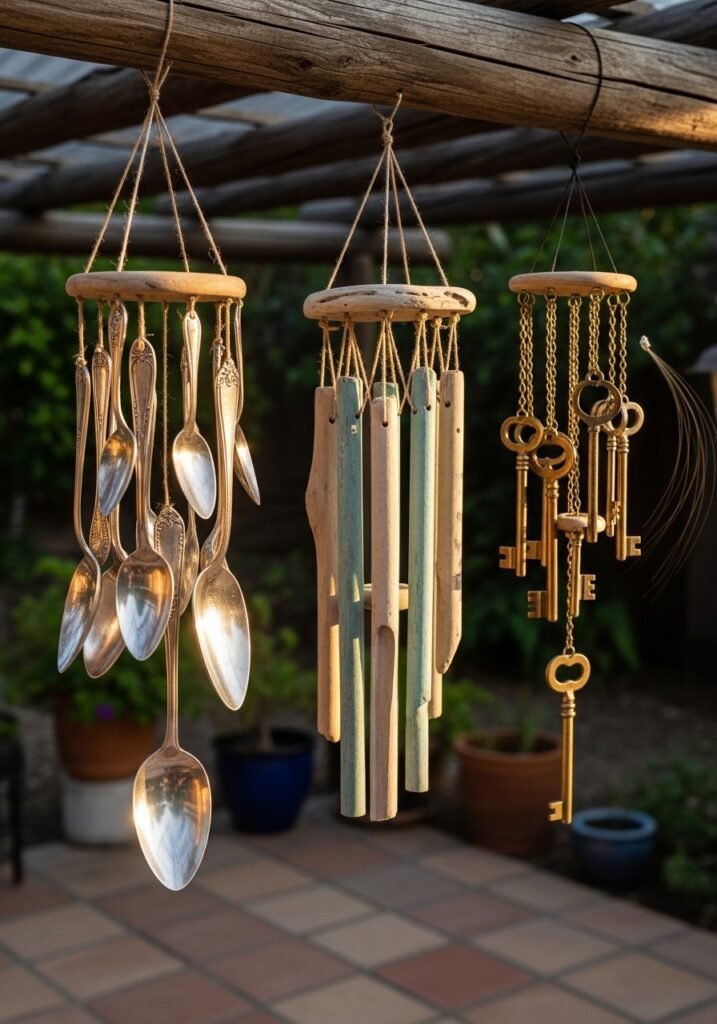 Different materials produce different tones—metal creates clear, ringing notes while bamboo produces hollow, softer sounds. Hang multiple chimes at various locations for a layered sound experience. Homemade wind chimes cost virtually nothing and add both visual interest and soothing audio to your small patio, making every breeze a delightful sensory experience.